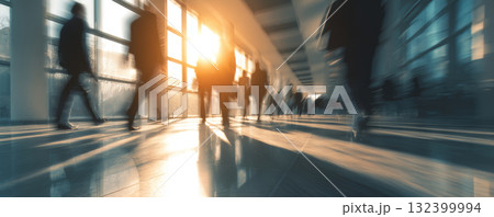 Business people sunlight motion blur modern office glass window busy urban morning walking teamwork create dynamic workplace scene