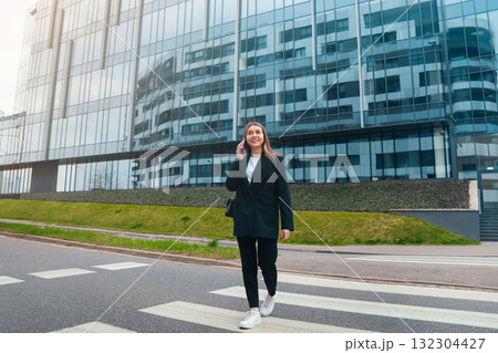 Young Woman Walks Confidently on the Sidewalk, Engaged in a Phone Conversation, Near a Modern Building in the City During the Day