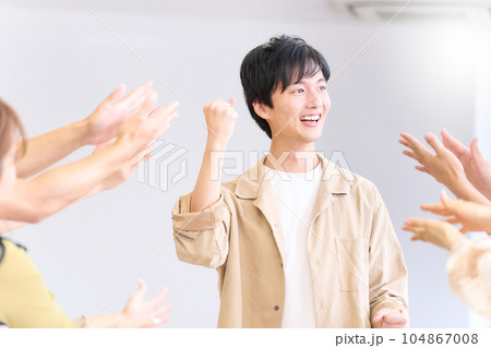 ガッツポーズを決める若い男性と拍手する人々の手
