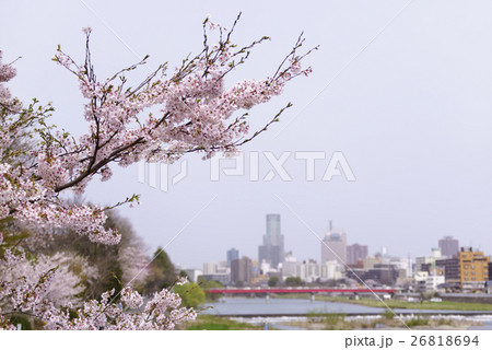 春爛漫桜が満開の広瀬橋(永町橋)から仙台市中心部を望む