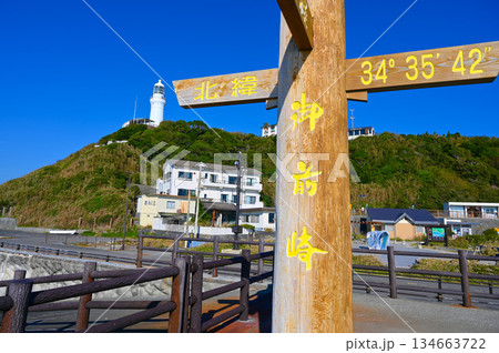 御前崎市にある点灯150周年を迎えた快晴の青空に映える白い灯台の風景(静岡県)