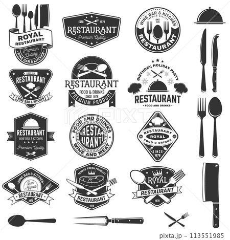 Set of Restaurant logo. Vector Illustration. Vintage graphic design for logotype, label, badge with plate, steak, cloche with lid, fork and knife. Cooking, cuisine logo for menu restaurant or cafe.