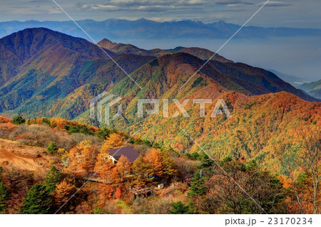 三ツ峠から見る紅葉の御坂山地と南アルプス