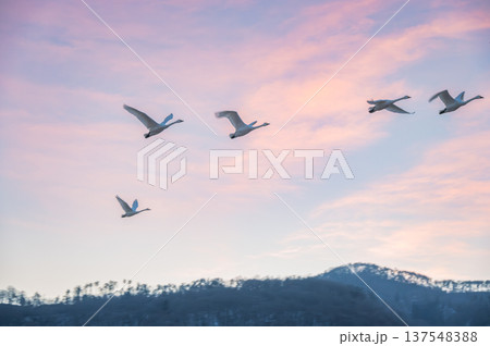 夜明けの空と白鳥の飛び立ち【御宝田遊水池】