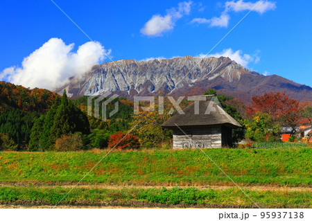 鳥取県 快晴の大山と実りの秋を迎えた御机の茅葺小屋