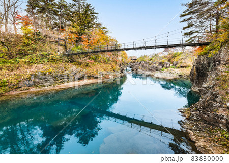 紅葉の渓谷岩手厳美渓と吊り橋の御覧場橋