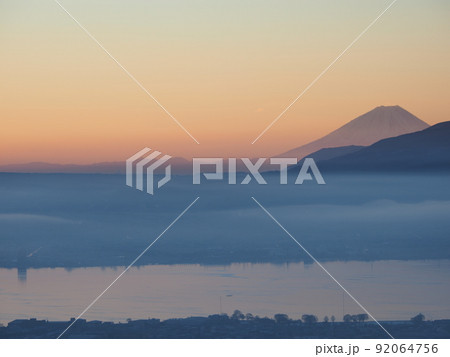冬の塩嶺御野立公園から薄霧に煙る諏訪盆地と朝焼けの富士山を望む