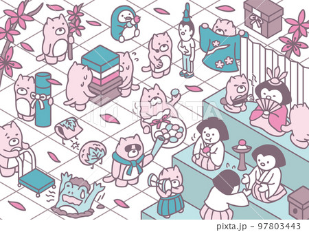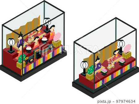 アイソメトリックなガラスケースに入ったひな人形のイラストセット