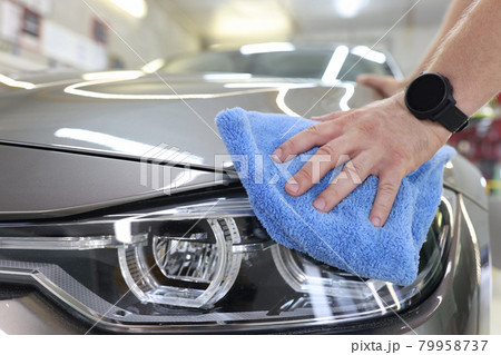 Man hand cleaning car and drying vehicle with microfiber cloth closeup