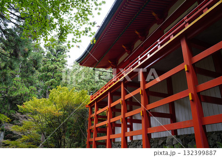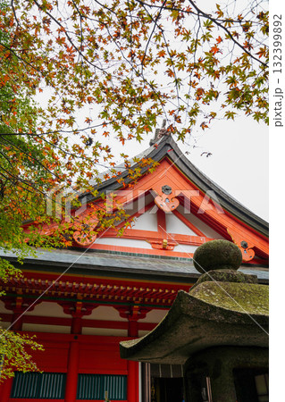 紅葉が始まった楓と延暦寺の朱塗りの建物