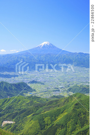 乾徳山山頂から望む富士山と甲府盆地 山梨県 山梨市