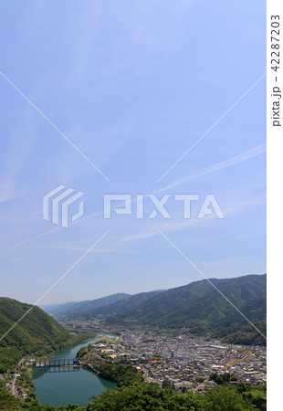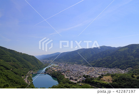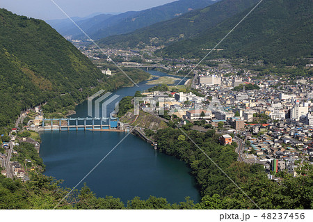 三好市池田町の市街地と中央構造線に沿って東行する吉野川、池田ダムと池田湖