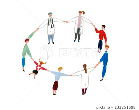 手描きイラスト 輪になって手をつなぐ医者と患者