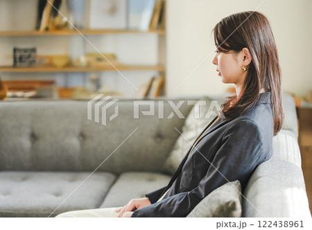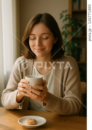 癒しの時間を楽しむ女性|カフェでコーヒーを味わう感情表現素材