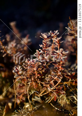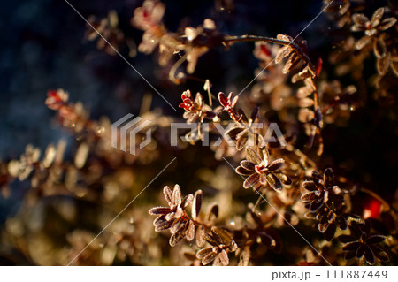 冬色に色付いたクランベリーが霜に覆われ輝く朝