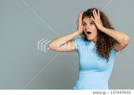 Young woman peeking out open grey door, covering mouth with hand. Looking shocked, surprised, astonished. Unexpected situation