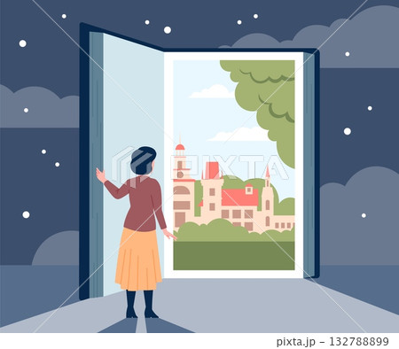 Book knowledge concept. Woman open new worlds with reading. Female character looking in giant book in fantasy story, imagination recent vector scene