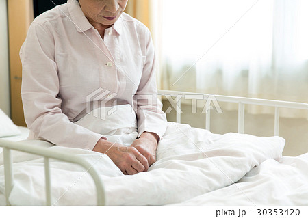 病院のベッドに腰掛けて気落ちしている女性(シンプルな色使い)