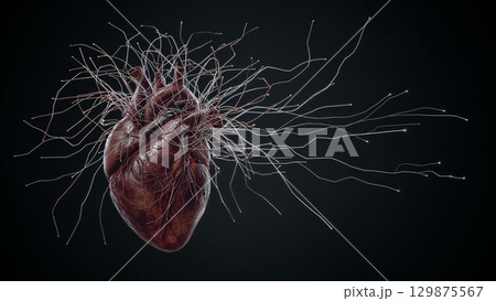 AI generated glowing human heart floating in data stream with neon light wires in sci-fi abstract environment symbolizing life force and futuristic medical visualization