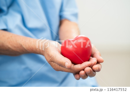 Asian doctor give red heart to elderly woman in her hand, heart Attack.