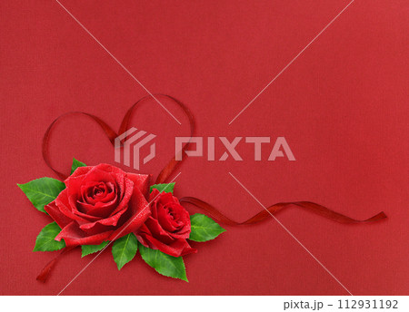 Red silk ribbon hearts and waves with rose flowers on red paper background