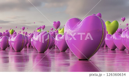 Heart-shaped decorations in shades of pink and green are scattered across a reflective surface, creating a lively atmosphere under a colorful sunset sky.