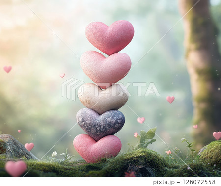 Stacked hearts in whimsical forest setting create romantic atmosphere, surrounded by soft greenery and floating hearts. This enchanting scene evokes feelings of love and tranquility