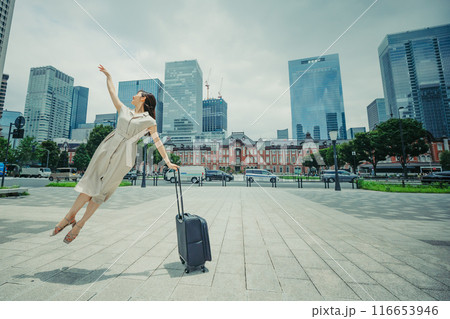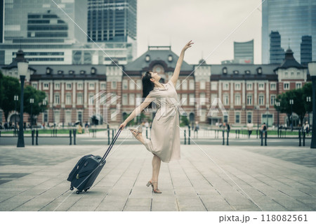 キャリーバッグをひいて旅にでた、若い女性心弾む様子