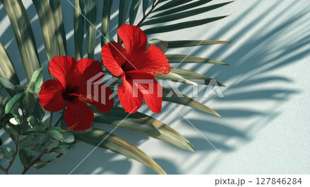 Red Hibiscus Blossoms and Palm Leaves