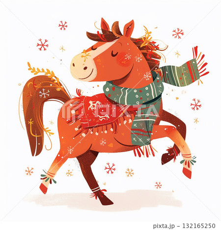 Cheerful horse in a festive scarf dancing in a snowy landscape during winter celebration