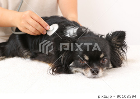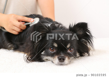 メディカルチェックのため心音を確認してもらうロングコートチワワ