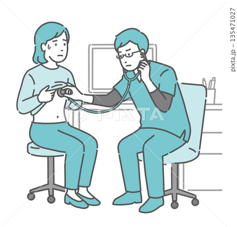 聴診を受ける冷や汗をかいた男性と深刻な表情の白衣の女性医師のイラスト