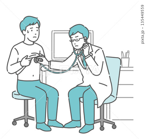 聴診を受ける冷や汗をかいた男性患者と深刻な表情の医師のイラスト