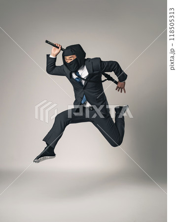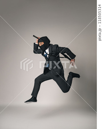 ビジネススーツを着てジャンプする忍者の全身写真