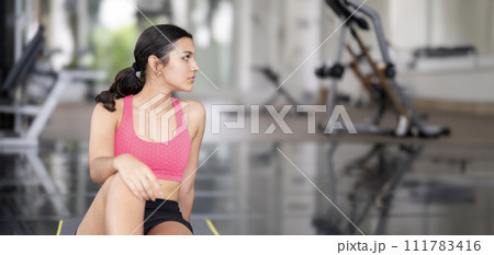 Woman taking a break during her gym session, a serene moment of contemplation amidst a vigorous workout routine. Contemplation and rest in fitness. concept.