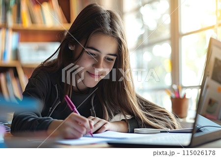 Smart small Caucasian girl sit at table with laptop studying at home. 6s child write exercise book prepare homework for school. Little kid handwritten notebook do task assignment. Learning, education