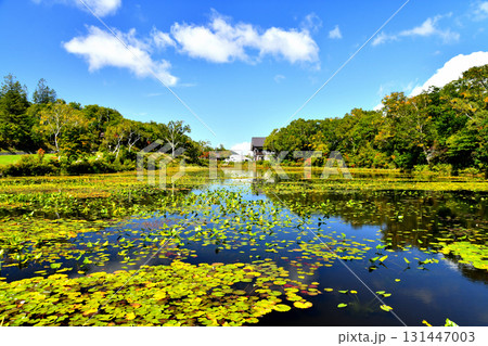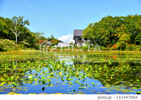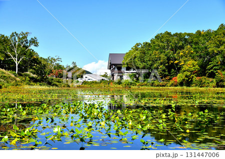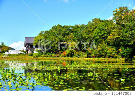 秋晴れの志賀高原 蓮池と志賀高原山の駅