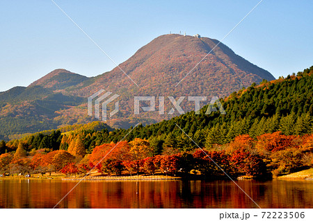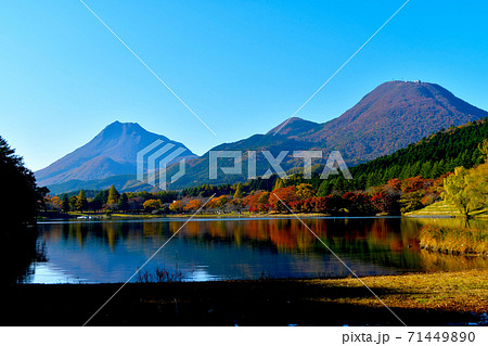 秋の志高湖と由布岳と鶴見岳 大分県別府市