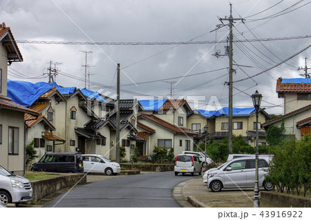 災害イメージ_屋根にブルーシートが掛かった被害住宅
