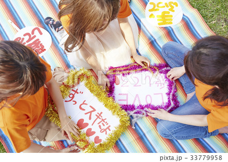 コンサートで熱狂的に盛り上がる女性ファン達 ペンライト うちわ
