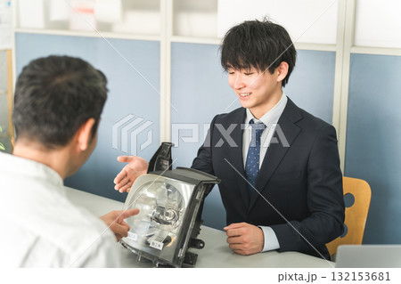 自動車整備工場の受付で接客をするサービスフロントの男性と顧客の男性