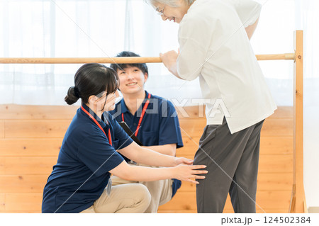 手すりを使い歩行訓練するシニア女性と介助する作業療法士,理学療法士の男女スタッフ