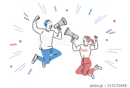 人物 メガホンを持って飛び跳ねながら応援する男女