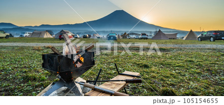 「静岡県」富士山が見えるキャンプ場で焚火を楽しむ