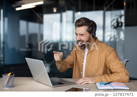 Mature businessman with headset shows frustration at laptop in modern office. Expresses stress during online work. Includes notebook, pen, desk, signifying professional setting.