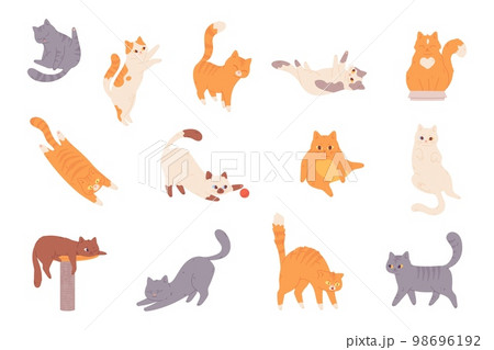 Cat behavior. Feline poses, cartoon cats characters funny emotions, afraid orange kitten scared animal pet cautiously pose and body language, happy playful pets vector illustration