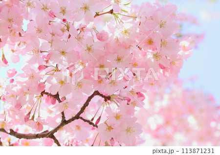 淡いピンクの思川桜のクローズアップ 【青空背景】 【空背景】