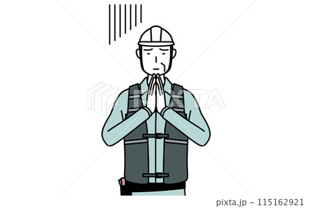 体の前で手を合わせて謝るヘルメットと作業着姿の男性