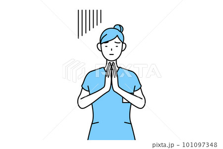 体の前で手を合わせて謝る女性看護師、理学療法士、作業療法士、言語聴覚士、看護助手