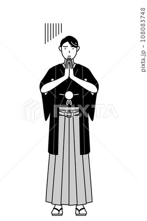 体の前で手を合わせて謝る紋付袴姿のシニア男性、お正月の初詣や結婚式で